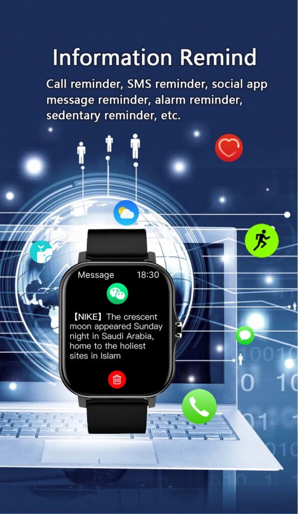* Synchronize information, synchronize time, and language. After the mobile phone is connected to the Bluetooth of the watch, the time can be synchronized. local language. climate. Various information reminders, etc.